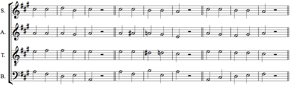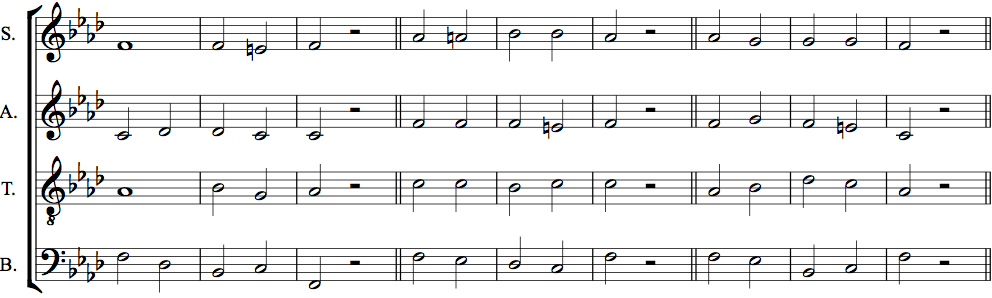 Here is an 8-bar example (a .pdf file) that's a pretty blatant rip-off of Schubert's Ave Maria but that does illustrate the instructions of the previous paragraph.