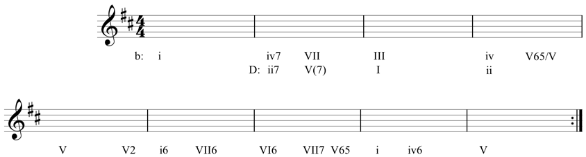 Write at least one melody for voice (any range, tempo, and mood) that conforms to the chord progression shown below, and that uses only traditional classical types of non-chord tones.