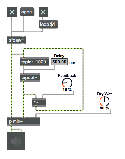 So there’s a problem with feedback in MSP. If an MSP signal chain included the necessity to have its own output in order to calculate its own output, you can see how that would be impossible (or would require an infinite amount of time). However, MSP calculates audio in “chunks” or “vectors” composed of several samples at a time (usually some power of 2, such as 64 for example, which would be just under 1.5 milliseconds assuming a sampling rate of 44,100 Hz). That means that if we’re willing to wait until at least one vector of samples has been calculated and sent out, we can use delay feedback. (Filter objects such as reson~ can use a shorter feedback time, because the object itself stores the fed-back information internally from one signal vector to the next.)